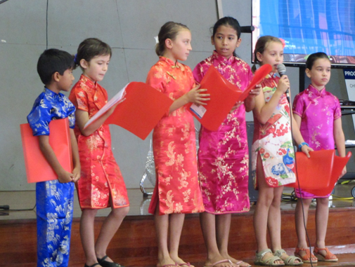 身着中国旗袍的小学生朗诵中文诗歌