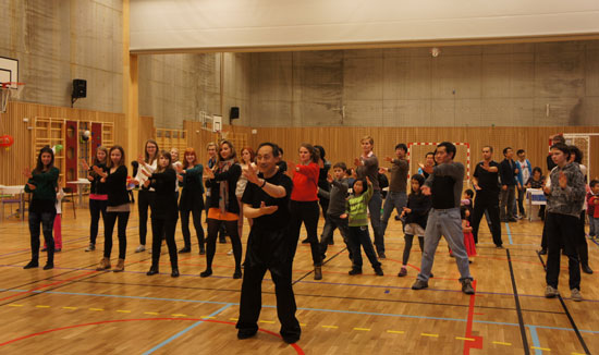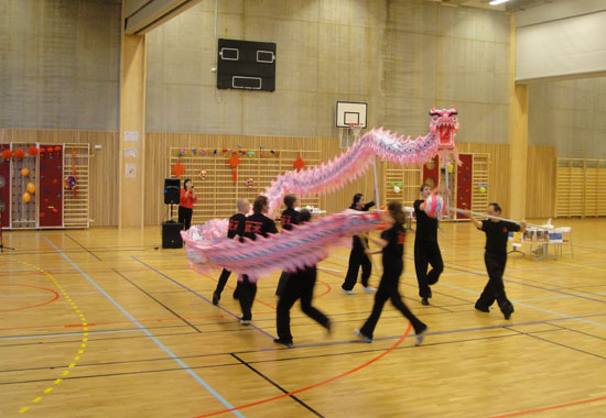 开幕仪式,登场亮相的中国武术表演引起了巨大轰动。首先是独具中国特色的舞龙表演,只见十余米的金粉色长龙在龙珠引导下舞动到观众面前。长龙在金发碧眼的武术学员手中演绎着不同的造型,整体线条流畅优美,真犹如一条俊龙漂洋过海来到了地球的另一边。伴随着激昂的锣鼓声,昂扬向上的龙的精神被呈现得淋漓尽致。其次是武术师生的套路表演,从十来岁的挪威小朋友到年过花甲的武术老师,从刚劲有力的刀术到柔美舒缓的集体太极拳,伴随或激昂或抒情的背景音乐,把活动现场推向一个小高潮!再次是由散打学生带来的技术展示,虽不像舞龙能舞动全场,但散打体现出来的一招一式,让观众欣赏到了切切实实的硬功夫。