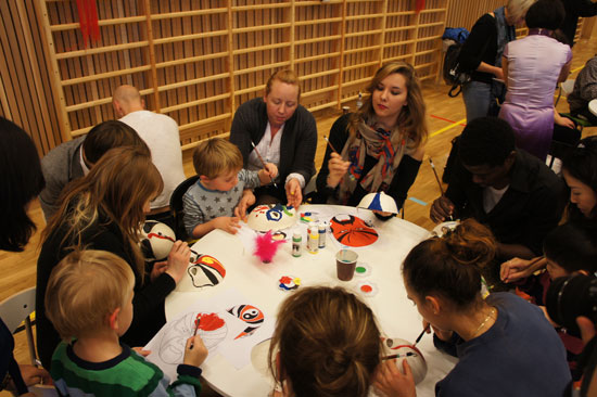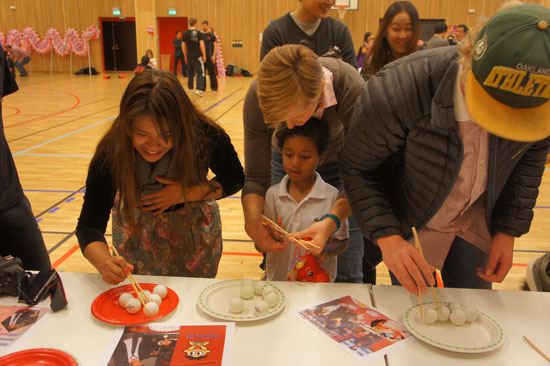 少儿体验活动中,精心设计了踢毽子、抽陀螺、筷子游戏、编中国结、画京剧脸谱和学习中国剪纸等一系列生动有趣、动静结合的特色文化体验。每个展台和体验活动区都人头攒动,充满情趣。踢毽子吸引了很多小孩子,当然也有陪同的家长,中学生和大学生,他们三五成群,互相传踢毽子。为了让毽子的传递不停下来,就需要大家的配合,这种方式使挪威青少年感受到了中国传统游戏里的乐趣与合作意识。筷子游戏是以家庭为单位,互相比赛,看谁能在最短时间把最多的乒乓球夹到另外一个盘子里。一位名为Ingve的挪威市民带着他刚满一岁的女儿Ida一起参加了这个活动。小Ida紧紧地抱住爸爸,和她爸爸一起完成了比赛,爸爸自豪地说这是他们父女俩的胜利。各种“动”的活动充满了欢笑声,同时静的体验也吸引了许多挪威人参加,在孔院老师的细心指导下,他们专注地编着中国结、画着中国脸谱、剪着双喜字……不同风格的作品在肤色各异的主人手上完成,每个人都感到了收获的甜蜜,他们说要把自己的作品带回家保留起来,整个活动现场喜气洋洋。