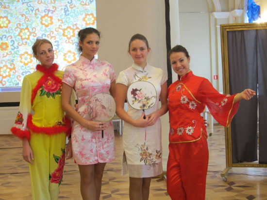 “中华文化周”开幕仪式11日下午两点在圣彼得堡青年宫正式开始,圣彼得堡市、瓦西里区官员、中国驻俄中资机构代表,圣彼得堡地区华人华侨社团代表、孔子课堂的韩丹星院长共同剪断了红飘带。“中华文化周”系列活动之一“旗袍秀”在一片掌声中拉开帷幕。俄罗斯姑娘伴着悠长深远的中国古典音乐,将旗袍与青罗扇、油纸伞等中国传统艺术相结合,举手投足之间,向在场的各国客人展示了中国的音乐之美、衣饰之妙、工艺之精,引得各国客人惊叹连连,掌声不断。