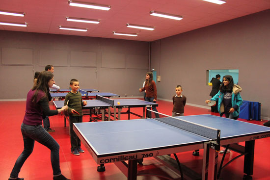 在第一个环节,孔子学院师生与专业教练和职业选手进行互动对打,你一个极速球,我一个回挡,你再轻轻一推球,我便使劲一扣球,对方慌了神,没有接到球,于是得分。球场上,类似的场面比比皆是,观众不时发出阵阵喝彩声和热烈的掌声,也有观众不时地传出笑声。参加乒乓球体验活动的有5岁的儿童班学院,也有75岁的老年班学员,有大学生也有中小学生。孔子学院理事长Alain Mignot 和孔子学院的老师们和学员在球场积极互动,场面非常热闹。