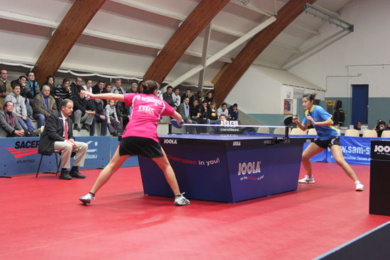 在第二个环节,孔子学院师生可算是饱满了眼福,因为一场别开生面的法国女子甲A联赛已经上演。在正式比赛中,乒乓球在台上来回飞舞,一会落在这儿,一会落在哪儿,所有观众的眼睛都紧紧地盯着那只小球,脑袋也随球来回摆动着,最后使人看得眼花缭乱。其中普瓦提埃队球员,最后以一个漂亮的弧线球结束了一局胜利,博得了雷鸣般的掌声。