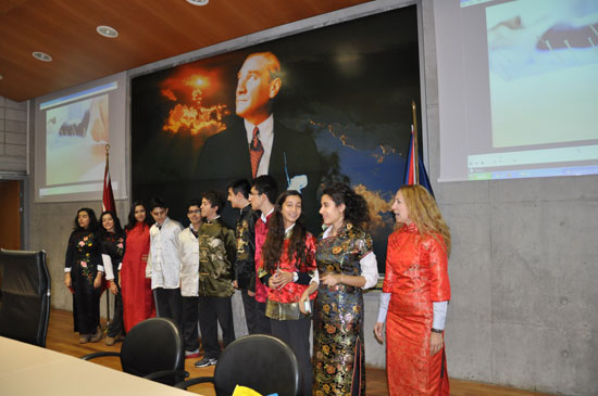 中东技术大学孔子学院的老师们向泰德学校介绍了中国的概况、世界孔子学院的分布和中东技术大学孔子学院的概况。在泰德学校的礼堂里,几百名师生一边聆听着优美的中国音乐,一边从不断变换的幻灯片上了解中国的历史、地理、饮食、服装、节日、电影。当看到雄伟的长城、绚丽多彩的传统服饰、令人垂涎欲滴的中国美食和功夫明星李小龙和成龙时,师生们情不自禁的欢呼起来。