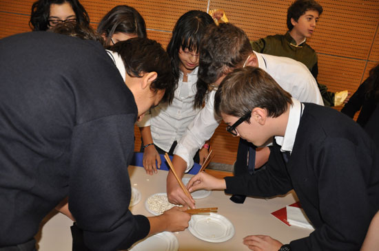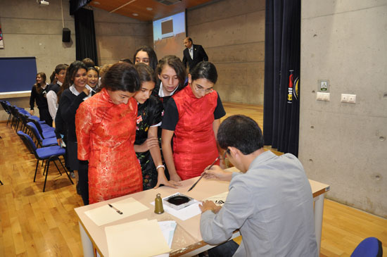 在传统文化体验活动中,吕庆发老师的毛笔字受到了泰德学校学生们的追捧,同学们排着长队请吕老师用毛笔写他们的名字。陈锦娟老师教大家编中国结,王亚克老师带大家踢毽子,还有很多学生试穿中国服饰,练习用筷子夹豆子。礼堂里一片欢声笑语,一个小时的体验时间结束了,同学们还不愿离开。