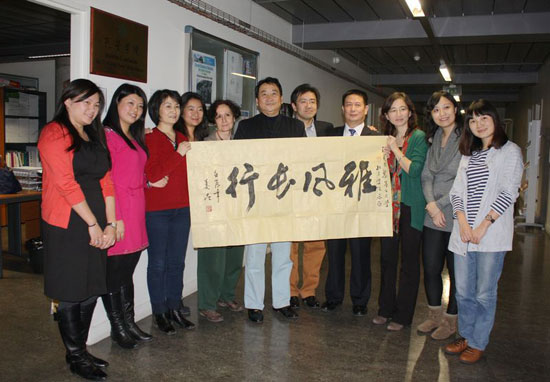 演讲结束后姜昆向孔院赠送了自己的书画作品集,书籍及墨宝,并与孔院教师们合影。