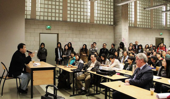 演讲由巴黎七大孔子学院中方院长周汉斌先生主持,中国驻法国使馆金春雷新闻参赞及姜昆的法国友人一同参加并聆听了整场演讲。