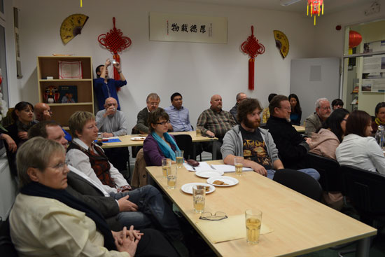 孔子学院小小的会议室里挤满了近30位来宾,其中有东亚协会的会员,中国留学生,还有正在孔子学院学习中文的德国学生, 而中方院长毕玫女士作为本次活动的组织者之一也出席了本次座谈会。此次座谈会也邀请了在埃尔福特大学留学的张博菁同学,专业是钢琴演奏的她在开场表演了中国传统名曲“梁山伯与祝英台”,颇为专业的弹奏赢得了大家的喝彩。