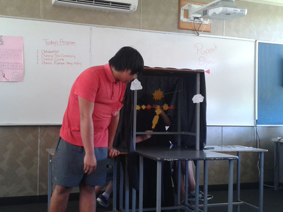 最精彩的部分要数中国神化故事。学生们独具创新的使用纸板做出了属于他们自己的“皮影戏”。盘古开天辟地、后羿射日、嫦娥奔月还有四海龙王,这些中国人耳熟能详的神话故事在这里却很少有人知道。以“皮影戏”的形式演绎,更是让所有人眼前一亮。
