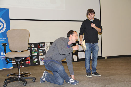 汉语节目表演将比赛推入高潮,百余名观众兴致勃勃地来到现场观看演出,其中有佐治亚州立大学的学生,参赛者的家人、朋友以及对中国和汉语感兴趣的社会各界人士。在佐治亚州立大学孔子学院院长顾宝桐教授简短致辞之后,汉语节目表演正式拉开帷幕,并由两名孔子学院学生用汉英双语主持。首先是几位幼儿园小朋友先后登台,用稚嫩的童声演唱汉语儿歌,引得全场掌声不断,随后孔子学院学生任海峰和罗兰索表演的小品《餐厅的故事》又令台下笑声不绝,节目表演接近尾声时,孔子学院学生麦茜身着一袭飘逸长裙亮相,以一首《月亮代表我的心》赢得满堂喝彩,并最终凭借其技高一筹的唱功将此项比赛的头奖敛入囊中。汉语节目表演由评委现场打分并宣布比赛结果,当场评出一等奖1名,二等奖2名,三等奖3名,各等奖品价值分别为200美元、100美元和50美元。参加各项比赛的所有选手都可获得鼓励奖,赛会也为此准备了精美的奖品。最后,佐治亚州立大学孔子学院院长顾宝桐教授、孔子学院中方院长陈忠教授、外文系中文课程负责人郦帅教授为各项比赛的获奖者颁发了奖品,并与参赛选手合影留念。