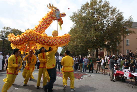 本届南卡大学国际教育周共有来自中国、韩国、日本、印度、沙特、约旦、阿曼、法国等20多个国家和地区的留学生组织在开幕式上设立展台,用丰富多彩的形式展示各国独特的魅力和文化,可以说是一个展示世界多元文化和魅力的绝好机会和舞台。南卡大学孔子学院特意为这次开幕式做了精心的准备。展台上精美的中国结、京剧脸谱、大红灯笼等充满浓浓中国味的展品和优美的中国风光非常惹眼,引来众多师生驻足;“体验汉语”、“起中国名字”等互动环节更是让许多外国人对汉语的发音、方块字有了更为真切的体验。不少学生把他们的中国名字贴在胸前,高兴地说:“我有中国名字啦!”我们的舞龙表演更是把这次活动推向了高潮。当八个中国留学生舞动着长达数十米的长龙登台亮相时,博得了雷鸣般的掌声和喝彩!华夏风光、方块字、中国龙,可谓是本届国际教育周开幕式上的焦点和靓点。