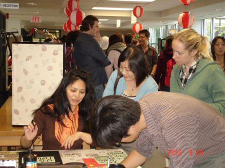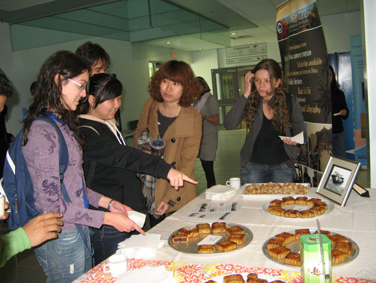 在滑铁卢大学的校园里,形色匆匆的学子忽然被一阵欢声笑语吸引,然后又不知不觉被一股茶香和饼香留住了脚步,于是想起,又到了滑铁卢大学瑞纳森学院每月一次师生共享的下午茶时光,但是望过去,桌上却不再是寻常的饼干,而是或圆或方,上面釉刻着汉字图样的几大盘新鲜食品,再看看,热闹的一群人正在和几位中文教师认真地学着一个词的发音“月——饼——”。旁边,又有一些人围着孔子学院院长李彦教授,翻看几本精美的中国民俗画册,并饶有兴味地听她介绍中国的又一个重要节日:中秋节。