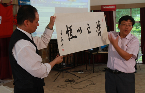 孔子学院学生深情演唱了《城里的月光》,郁大使和本院刘老师为大家挥毫泼墨,演绎书法的苍劲与洒脱,大使还亲自为在座的各位展示了几幅作品所蕴含的深意,令在场观众对中国书法的深厚底蕴惊叹不已。
