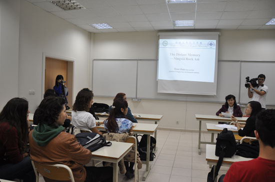 此次宁夏岩画艺术特展由宁夏岩画艺术讲座和宁夏岩画艺术图片展览两部分组成。11月19日当地时间5时,宁夏岩画艺术讲座在海峡大学孔子学院举行。宁夏回族自治区岩画研究中心乔华主任作了专题发言,具体介绍了宁夏岩画内容题材和艺术特色。土耳其数位考古专家、历史学家和考古专业学生等参加了本次讲座。演讲结束后,乔华女士赠送了十余幅拓片给海峡大学孔子学院。之后,乔华主任陪同专家们一起参观了40余幅岩画照片和拓片并作了详细介绍。