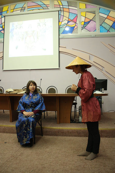 在整个过程中,老师将具有中国文化特色的典型词语、常用的汉语句式巧妙地贯穿在讲解中,积极带动学生边听边看边练,并以学唱古典诗词、表演话剧的形式达到了讲练结合和学习汉语获得成就感的目的,积极探索了汉语角活动的多样化和生动性,取得了良好的学习汉语和介绍中国文化的效果。