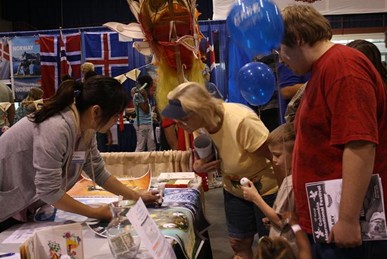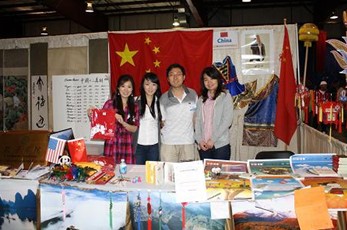 中国展区设在国际节入口处。展台前矗立着鲜艳的中国国旗,四周点缀着中国龙、熊猫等具有中国代表性形象的装饰;在气势磅礴的中国书法字画的映衬下,整个展台格外醒目,吸引了众多参观者前来参观、合影留念。青年书画家杭天的中国书画作品展出更让许多参观者驻足欣赏。中国美食一直是很多美国朋友的最爱,展区里供应的春卷、麻团、小笼包等等小吃很快就被抢购一空。