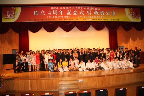 韩国泰成中高等学校孔子课堂中国语教育院成立四周年庆典于2012年11月23日在韩国泰成中高等学校大礼堂隆重举行。中国驻韩国大使馆教育处参赞安玉祥、 韩国国会议员李愚炫、京畿道议会议员兼行政委员长赵孃旻、龙仁市议会长等二十多位嘉宾及2500多名学生和家长代表参加了本次庆典。