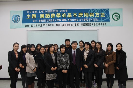 2012年11月30日下午,韩国外国语大学孔子学院举办了题为“汉语教学的基本原则与方法”的讲座,主讲人为中国资深汉语培训专家苏英霞教授(北京语言大学),现任韩国启明大学孔子学院中方院长。韩国外国语大学孔子学院的全体教师及首尔地区外语高中的汉语老师们聆听了本次讲座。