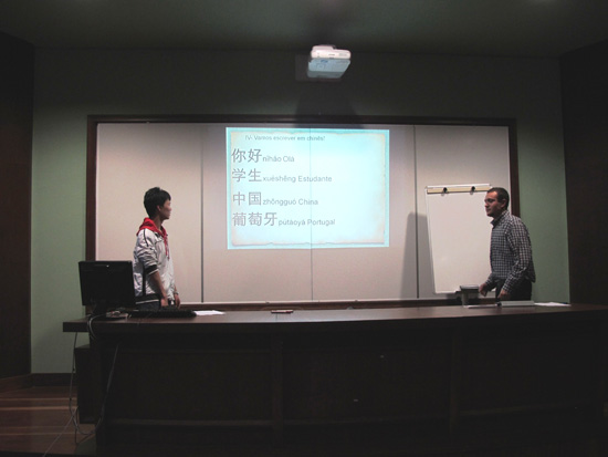 学术讲座室里,文学院二年级正在修习汉语的葡萄牙学生安德明、安国龙与天津外国语大学的中国留学生韦念新、和雷霄合作,用葡汉双语介绍了中国汉字的起源和发展,以及有趣的汉字故事,并介绍了中华历史知识、当代中国概况等内容。为了准备好这次讲座,中葡两国学生一起筹备了很久,反复修改演讲内容,反复排练,讲座非常成功。之后,葡国学生们兴奋地说,今天终于有机会展示我们的汉语言文化知识了!学习中文给我们打开一扇新大门,孔子学院的汉语课非常重要,我们热爱中国文化,喜欢汉语学习!中国留学生们也表示,看到葡萄牙学生学习汉语的热情如此之高,我们既感动又骄傲,汉语言文化的魅力在葡萄牙可见一斑。