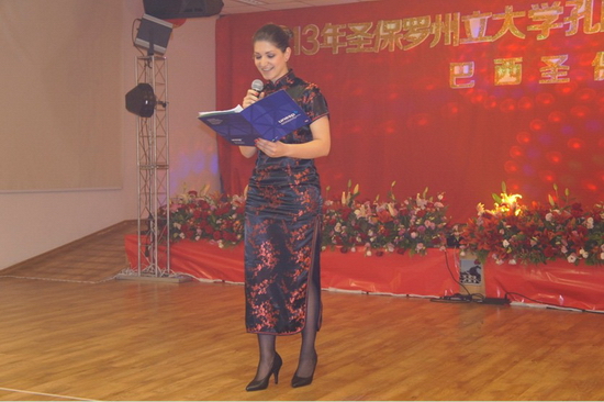 此次晚会由志愿者教师慕涛以及巴西本土汉语教师Verena主持。晚会当天,Verena一袭红色的旗袍打动了在座的所有观众。据了解,Verena是地道的巴西人,曾经在中国学习汉语数年,回国之后一直致力于汉语教学,并取得了优异的成绩。而当天,她流利的汉语也赢得了观众的热烈掌声,鼓舞了在场的学生