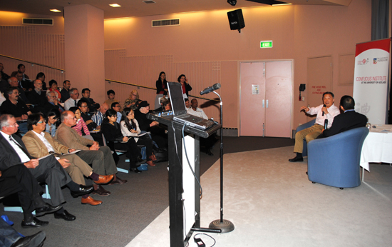 伴随中共十八大召开,中国第五代领导人走上历史舞台,中国成了近段时间以来澳大利亚人关注的热点之一。针对这样的情况,阿德莱德大学孔子学院把本年度第五次“中国高端论坛”定题为“中国新政前瞻”。和以往主讲人在讲台演讲、观众在讲座最后才能提问的方式不同,本次论坛以访谈的方式进行,由孔子学院院长高默波教授就几个主要问题进行提问,温铁军教授解答,在座嘉宾可随时提问或发表自己的意见。