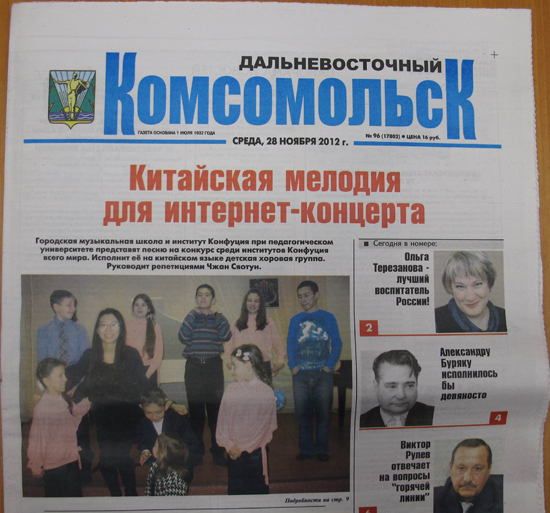 为配合孔子学院总部即将举行的网络春晚活动,阿穆尔国立人文师范大学孔子学院与阿穆尔共青城著名的市立音乐小学合作,精心制作了一台文艺节目。