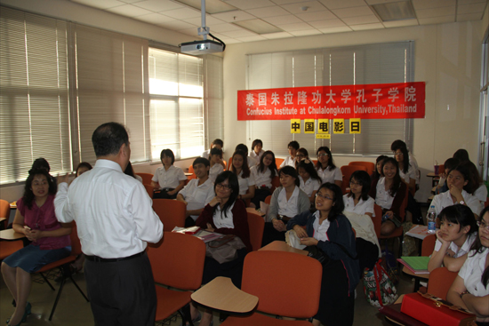 看电影学外语是国际上通行并被证明是行之有效的外语学习形式。中国电影人创作了大量反映中国的历史与现实、文化底蕴深厚的优秀电影作品,被各汉语教学单位广泛使用于教学中。为提高泰国学生学习汉语的热情、促进泰国汉语教学事业发展,朱拉隆功大学孔子学院于12月7日在朱拉隆功大学文学院举办中国电影日活动。来自朱大中文系的50余名学生参加了此次观影,朱大孔子学院中方院长傅增有教授、任课教师胥春凤等出席了开幕式。