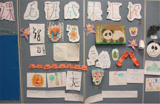 小朋友们除了学说中文、学写汉字,还动手制作了很多和教学内容相关的手工作品,并学写了书法。龙面具、熊猫面具、南瓜剪纸、纸电话、数字杯子等作品贴满了整个展板。看着这些手工制作和隶书、楷书、行书几幅字体不同、风格迥异的书法作品,每个人都惊叹于孩子们惊人的学习能力和无限的创造力。