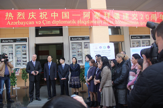 2012年12月05日当地时间上午11时,风和日丽,阿塞拜疆国家通讯社(阿通社)大厅及大门两旁已挤满来参观的人群,多家新闻媒体已经占在了有利拍摄位置,入口上方高高地悬挂着鲜艳的横幅“热烈庆祝中国-阿塞拜疆建交20周年”,“中阿友谊 万古长青”--这里正进行着“新华影廊”暨“孔子学院快乐中国行”活动图片阿塞拜疆巡展第二站--阿通社的剪彩仪式。