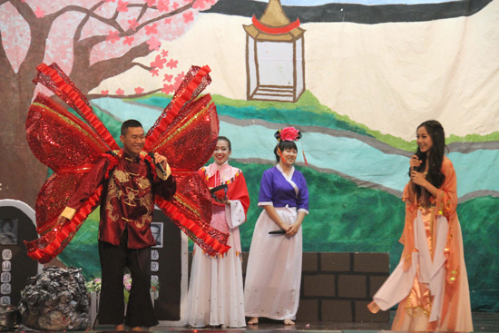 《西游记》这一出话剧表演截取了“三打白骨精”的片段,讲述了唐僧师徒在往西天取经的路上与妖精“白晶晶”斗智斗勇的故事。演员们精彩的扮相、收放自如的表演以及别出心裁的舞台布置,都让整出话剧精彩绝伦。梁山伯化作蝴蝶与英台相会的一幕,为整场表演画上了圆满的句号。