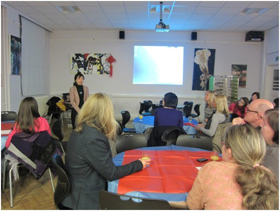 普利茅斯教育局国际交往部的Jill Bailey女士、德旺普女校校长AnitaHemsi女士和该校语言部主任Denise Broadbent女士也参加了活动并和大家分享了她们自己访问中国的经历。德旺普女校的李月梅老师还组织学生教给家长一句实用中文,家长们兴趣勃勃地念起“平平仄仄”来。两位汉办老师也和家长们做了交流。伴随着悠扬的中国音乐,与会者一起拿起筷子品位中餐,小小的学生餐厅顿时洋溢在轻松和欢快的气氛中。