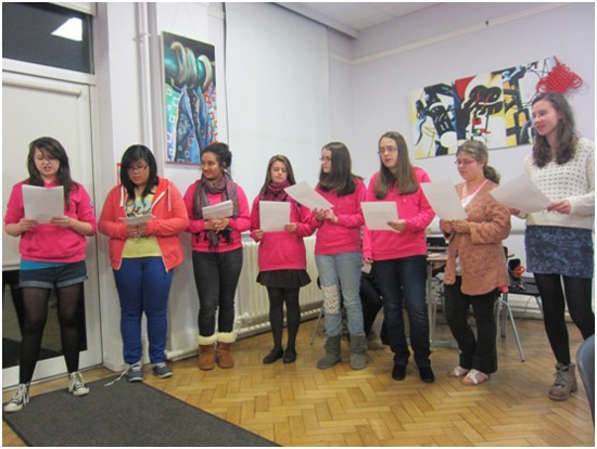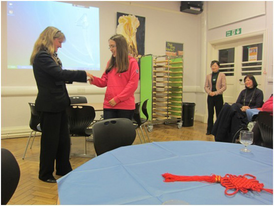 十三位女孩儿分享了今年十月参加国家汉办举行的“汉语桥英国学生秋令营”的经历。为期两周的中国之旅让孩子们对这个向往已久的国家有了第一线的了解,以多种形式感受到了中华文化的魅力,人们的热情友好给她们留下了极其深刻的印象。这些十年级、十一年级的学生们一边展示着秋令营的帧帧照片,一边向来宾讲述着自己的感受和体会,会场里不时地传来愉快的笑声。