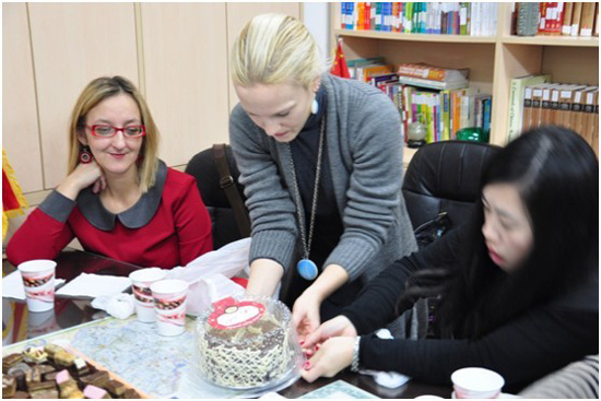 2010年获汉办“国际汉语教育专业硕士培养计划”奖学金,2012年在中国传媒大学完成硕士学业的坦尼娅老师,学成后回贝尔格莱德孔子学院,在孔院成人班和中学汉语教学点担任汉语教师工作。茶话会上,特意带来蛋糕与同事们分享学成后的喜悦。