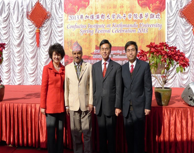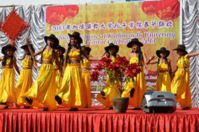 2013年1月26日,加德满都大学孔子学院成功举办2013年蛇年春节联欢。中国驻尼泊尔大使杨厚兰,中国驻尼泊尔大使馆经商处参赞弟蓉,中国驻尼泊尔大使馆文化处主任张冰,尼泊尔总理府首席秘书里拉•马尼•鲍德尔,尼中文化教育协会主席哈里士•昌德拉•沙阿、尼中经贸协会主席阿努普•巴特拉伊,加德满都大学副校长巴特曼•杜拉达尔,加德满都大学各学院院长、部门主管、部分教师,特立布文大学国际语言学院院长巴姆•德福•阿迪卡里,使馆工作人员、中资机构代表等,与加德满都大学孔子学院师生以及孔院下设孔子课堂和教学点学校负责人,孔子学院留华学生校友会成员等三百多人,欢聚一堂,共迎蛇年春节 。
