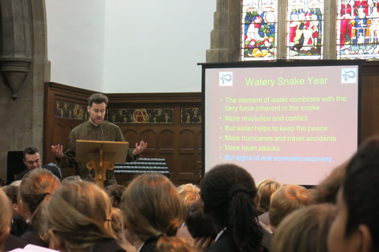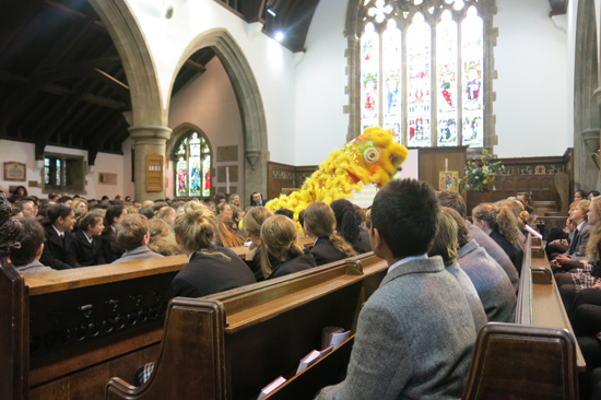 2013年1月28日早上8:30,英国Brighton College按惯例在教堂举行全校晨会,这周的主题是迎中国新年。首先,布莱顿中学孔子课堂负责人Thomas Godber先生用一口流利的中英文介绍了中国年的来历,春节的习俗和春节用语,他的幽默和风趣不时引得全校师生的欢笑声和掌声,在演讲结束之际,教堂里全校师生都情不自禁地跟着Mr. Godber 一起说起中文来:“新年快乐!恭喜发财!”