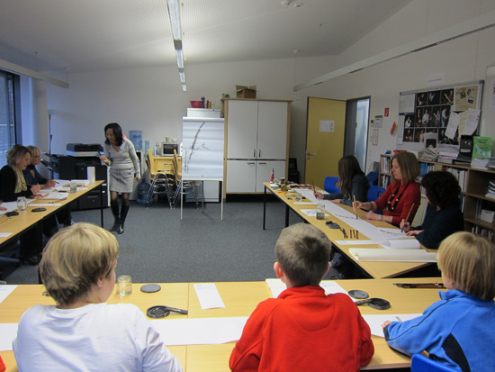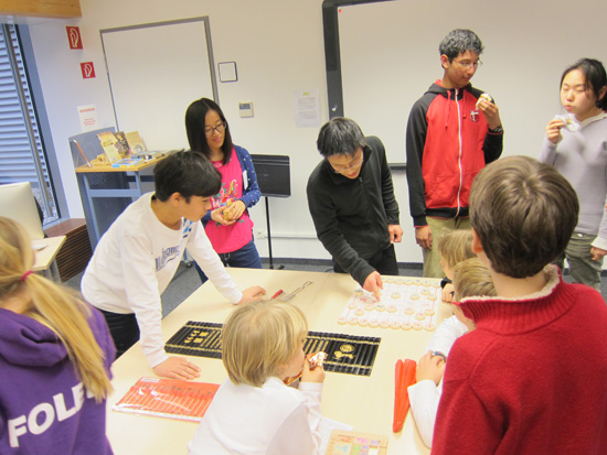 演出活动结束后,慕尼黑孔子学院的康伟老师为大家提供了茶艺表演;周玫老师现场作画,展示了中国的水墨绘画技法;汉语志愿者教师雷丽丽及张静媛两位老师进行了中国剪纸及传统游戏的演示。很多学生、家长以及BIS学校的教师在观摩、欣赏过后,亲自动手参与其中。有的人一边品着香甜的花茶,一边询问中国茶艺文化的各种讲究;有的人拿起毛笔,跟着老师临摹并创作一幅中国画;有的学生专心地研究着中国象棋的棋盘及下法;还有的学生拿起剪刀,体会中国剪纸的奥妙,他们不仅学会剪老师教的作品,有的甚至还创造性地剪出了自己的作品。