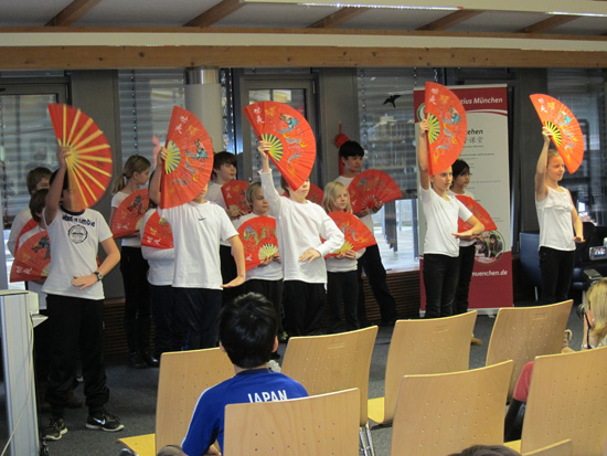 随后,中文课堂的学生们在傅大平老师的率领下亲自给大家拜年,并表演了中国功夫扇及中文歌曲联唱等节目。惟妙惟肖的表演博得了在场每一位观众的阵阵掌声和欢笑,很多家长全程拿着摄像机拍录着这些精彩的瞬间。之后,参加过2012年慕尼黑孔子学院组织的赴北京及上海、安徽夏令营的学生们以及曾经在中国生活过的学生们展示了他们心中能体现中国特色的各种照片,并叙述了他们在中国的生活以及切身感受。这些照片和故事让那些没有去过中国的学生及家长也能近乎身临其境地走进中国。