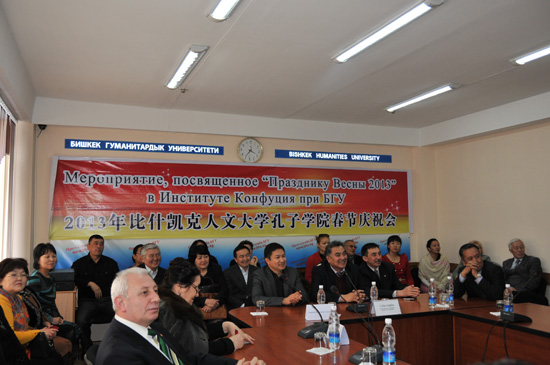 2013年2月8日下午3点,比什凯克人文大学孔子学院隆重举办蛇年春年文化活动。吉尔吉斯斯坦政府副总理卡米拉•塔利耶娃,中国驻吉尔吉斯斯坦大使馆王开文大使携夫人谷平女士及全体使馆人员,以及吉尔吉斯斯坦比什凯克人文大学校长穆沙耶夫•阿不都达和所有的副校长、系主任、教师、学生,吉尔吉斯斯坦国立民族大学校长伊莎米蒂诺夫•伊斯坎德尔,吉尔吉斯斯坦——土耳其玛纳斯大学校长萨巴哈丁•巴尔吉,外交学院校长阿吾提穆扎耶夫•努尔兰,比什凯克人文大学孔子学院全体教师、志愿者,新华社驻吉尔吉斯斯坦分社、《文汇报》驻吉尔吉斯斯坦分社,吉尔吉斯斯坦华人华侨协会副会长及代表,中国南方航空驻比什凯克分公司经理,共200多人参加了此次活动。