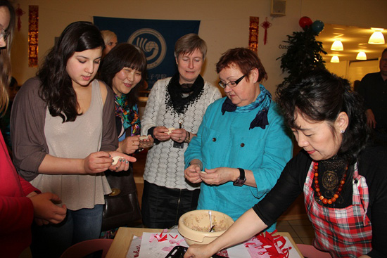 在接下来的文艺表演中,老师和学生们表演了武当功夫、中文歌曲、诗朗诵、小提琴独奏、书法等节目,现场观众参与了绕口令比拼、文化知识竞猜、剪纸和包饺子等活动,共同分享了中国传统佳节的快乐与喜悦。40岁的吕勒欧孔子学院学员罗兰先生一直被中国文化深深吸引,今天他为大家带来了一场精彩绝伦的功夫表演,他向观众们展示的以柔克刚、以静制动的武当功夫赢得了在场观众热烈掌声。