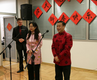 申大使在致辞中感谢孔子学院举办中国春节联欢活动,并向来宾致以节日祝福。申大使表示,萨大孔子学院作为欧洲最年轻的孔子学院,虽然成立不到一年,但已取得快速发展,成为克罗地亚的中国文化中心,以及所有希望了解、学习中国语言文化的克罗地亚人心目中的殿堂。申大使感谢萨格勒布大学、孔子学院师生和克各界友好人士为孔子学院所做的贡献。在蛇年里,有悠久历史和灿烂文化的克罗地亚将加入欧盟,申大使希望克作为欧盟新成员国为中欧文化交流与合作做出更大贡献,也祝愿萨大孔子学院越办越好。