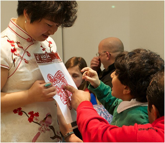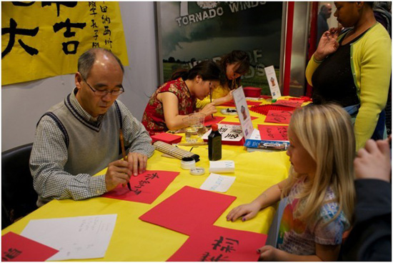 课后工作人员为主动前来课堂求学的孩子和家长发送由国家汉办远道寄来的礼物------汉语学习书签,作为新年礼物留念。本院外方院长郑冠平博士亲自书法,用准备好的红纸为孩子和家长们写他们的中文名字,我们的展台前从活动开始到结束一直都排着长龙,大家都对中国的汉字和文化着了迷,有的小朋友还一次又一次地排队,希望给他的家人和未能出席活动的朋友索要中文的书法签名留念。