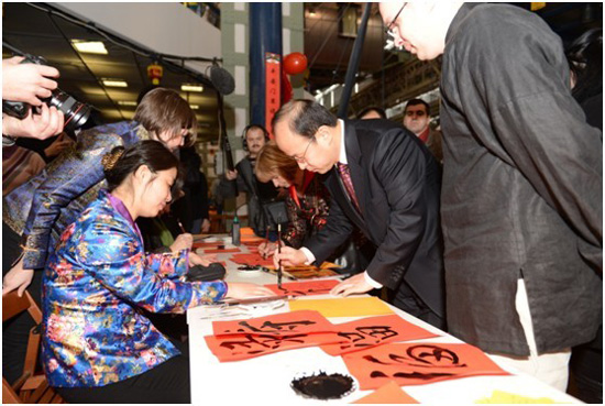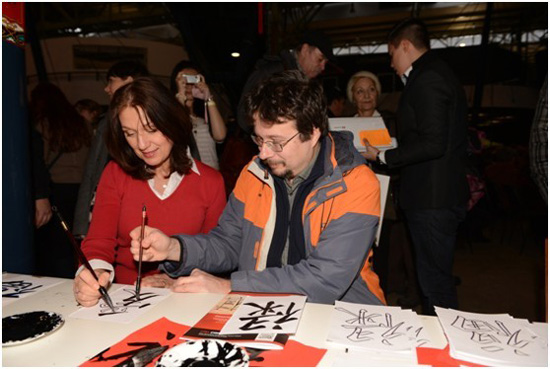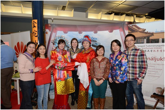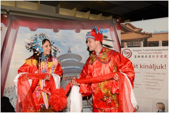 匈牙利塞格德大学孔子学院为本次活动精心准备了用毛笔写汉字祝福、穿中国传统结婚礼服摄影及中国知识竞赛等三个主题活动,神奇的中国书法、华美的中式礼服吸引了众多匈牙利民众前来参与,场面热闹非凡,人人喜气洋洋。