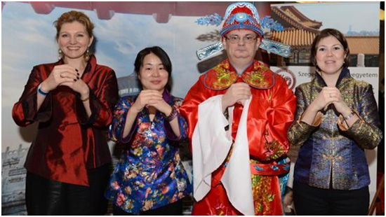 匈牙利著名媒体人Jáksó lászló兴致勃勃地穿上新郎服与塞格德大学孔子学院的张雪梅院长、辛莉薇院长、匈牙利著名汉语翻译Adrienn Simon向大家拜年。