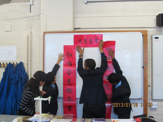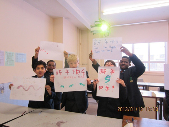 1月18日英国达特福德为了让学生了解春节文化,庆祝蛇年的到来,举办了“庆春节,画海报”活动。这个活动参加者是学校七、八、九年级对中文感兴趣的同学,学生自愿报名参加。由于学生每日课程比较紧张,所以活动时间定在了中午午餐时间。可是虽然是午餐时间,学生们还是踊跃参加。