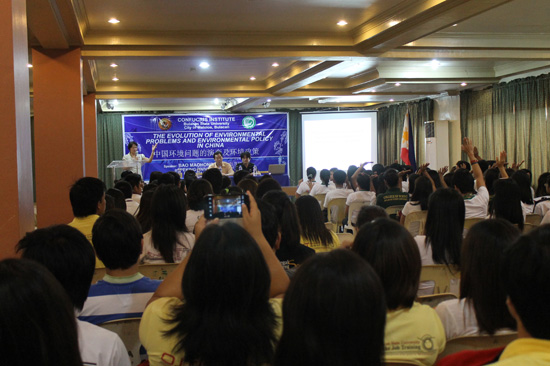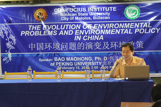 15日下午2点,布拉卡大学多功能厅座无虚席,来自自然科学学院、教育学院、法学院、文学与艺术学院以及新闻学院的260多名学生和老师在此等待讲座的开始。此次讲座的题目为《中国环境问题的演变及中国的环境政策》,主讲人为北京大学历史系包茂红教授。包教授是环境史与亚洲史研究方面的专家,对菲律宾的历史及其环境史的研究也卓有建树。讲座中,他使用了多幅具有代表性的图片,配合简明易懂的语言,浅入深出地为布拉卡大学师生阐释了从1949年到1989年这四十年间中国发生的环境问题以及中国政府为改善环境所做出的努力。包教授认为,对中国环境的研究应该从内部与外部两个方面切入;与此同时,也不能忽略了在那个时代中的世界大背景,任何一个问题的产生与发展都不是单一的,总是与外界的大环境息息相关。最后,包教授还就菲律宾的环境政策与中国的环境政策做了比较,并对菲律宾在环境保护方面做出的努力表示了赞赏。