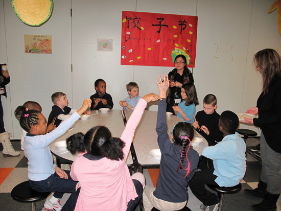 在饺子节上,全校师生和家长志愿者们兴致勃勃地一边观看孔子学院中文教师们亲手示范和面、擀皮、和馅、包饺子、煮饺子的全过程,一边认真聆听和记录各个步骤的具体做法,不少人还亲手包了饺子。随后大家还一起学着用筷子品尝美味的饺子,吃着自己亲手包的饺子,老师、学生和家长志愿者们赞不绝口,他们纷纷表示中国饺子好吃易学,以后不仅要在家里学做中国饺子,还要多练习用筷子吃饺子。(克利夫兰州立大学孔子学院中文教师辛玉彤撰稿、刘文政摄影)