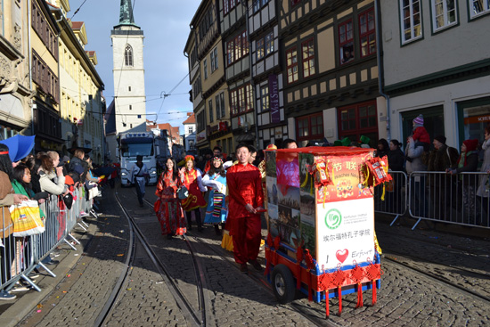 伴着近来少有的明媚的阳光,德国时间2013年2月10日,北京时间大年初一,埃尔福特市第38届狂欢节大游行于下午1点在德国图林根州的首府埃尔福特市的大教堂广场正式拉开了帷幕。在57支队伍中埃尔福特孔子学院游行方阵被排在第20位方阵出场。据当地媒体报道,当天道路两旁共有近8万多名观众观看了此次游行。游行队伍经过了埃尔福特的大街小巷和著名的安德里斯大街,最后又回到大教堂广场,活动持续了近4个小时。
