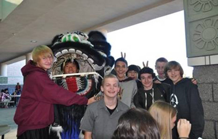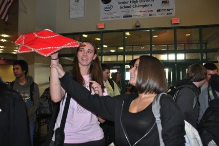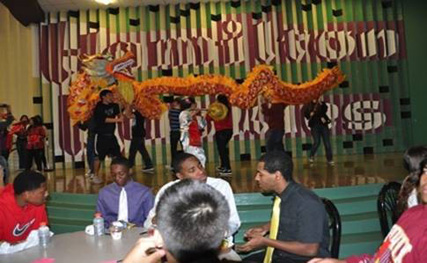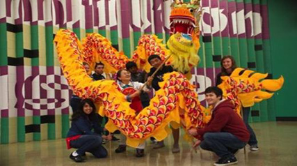 上午9点45分,亚利桑那州立大学孔子学院在Hamilton高中餐厅的大屏幕上开始播放有关中国传统新年的幻灯片。一千多名正在用餐的Hamilton学生一边津津有味地吃着午餐,一边欣赏着孔子学院为他们精心准备的幻灯片。突然,响起了一阵欢快的舞龙音乐,一条金光闪闪的龙缓缓移动到餐厅舞台上,定睛一看,原来是Hamilton高中学习中文的学生们来向大家拜年了。在舞台的另一角,一头黝黑的狮子也不甘示弱地窜上了舞台,只见它闪动着一双大眼睛,上蹦下跳,时而打滚,时而扑蝶。台下的学生们都津津有味地观看着,不时发出阵阵掌声。学生们精彩的表演拉开了亚利桑那州立大学孔子学院中国文化日的序幕。