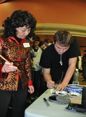 观赏完表演的学生们又涌到了孔子学院搭在餐厅外的各个展台上。孔子学院将每个展台都布置得充满了浓厚的中国特色。有的学生围在知识角,他们仔细阅读着春节传统,十二生肖,元宵节等各种展板,感受着一个古老国度的传统文化;有的学生围在摄影展台,欣赏着往年各届摄影比赛中获奖的佳作,其中也不乏Hamilton学生们的得意之作,看着自己同学眼中的中国,他们也有了自己心中的中国的模样;有的学生围在国法书法展台周围,看着孔子学院特邀的老师现场将他们的名字变成一个个陌生的方块字,他们赞叹着老师居然能用寥寥数笔就勾画出了意境浓重的水墨山水竹鸟。有些好奇的学生早已跃跃欲试地拿起毛笔,学着老师的样子,蘸起墨水,有模有样地勾勒起来;有的学生则围在传统玩具装饰品展台前,他们兴奋地把玩着从未见过地九连环,华容道,琢磨着中国结的做法,还有的学习着如何用手指转手帕。