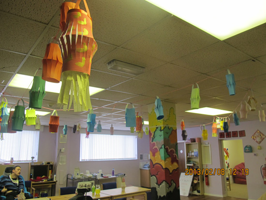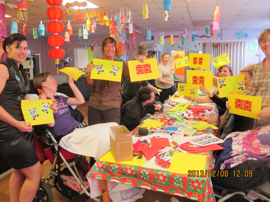 “明爱护理”的工作人员事先做了很多准备。几位女士穿着旗袍,大厅里挂满了他们制作的灯笼,还专门贴上了汉字“新年快乐!”。首先我们介绍中国春节,让大家都知道中国蛇年的春节是2月10日。用英语互道“中国新年快乐”。然后教大家用汉语唱英文翻唱歌曲“新年快乐”。第二项活动是剪制大熊猫,将大熊猫按轮廓剪出,再剪出竹子,分别贴到纸上。第三项活动是剪制双“喜”字,贴到纸上。整个活动,实际上一直是工作人员们在亲手操作,残障人士在观看。最后大家举着他们完成的作品齐声欢呼,气氛十分热烈。