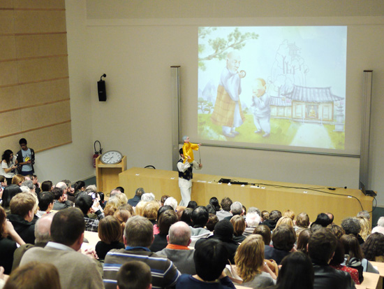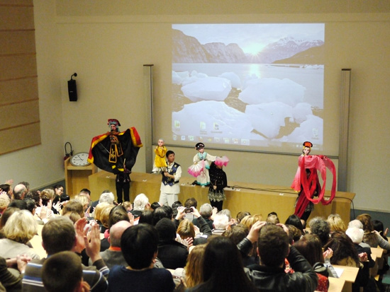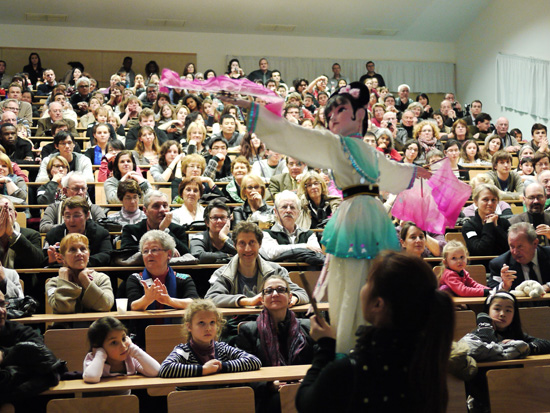 在体会了中国特色饮食之后,来宾们欣赏了中国特色的木偶剧表演。扬州木偶戏团的演员们结束了在巴黎的演出之后,特意来到普瓦提埃表演。为了更符合法国观众的欣赏关以及突破语言的障碍,剧团特地准备了五个风格各异的剧目:《扇韵》、《草裙舞》、《戏耍佛珠》、《长绸舞》和《变脸》。在表演大厅中时时传来观众们热烈地掌声和开怀的笑声。此外,孔院工作人员还举行了抽奖的活动,为来宾送上新年的礼物和诚挚的祝福。而在场的每位儿童学员都兴奋地领取了孔院特地准备的新年礼包。